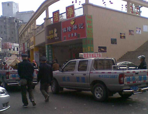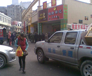 市城管大队联合有关部门对乱摆乱买的现象进行治理,大约30人的队伍从淘金湾一直向市府行进,一路上对现象进行治理。上图为镇隆祥记乱摆桌子占街,桌子被没收。